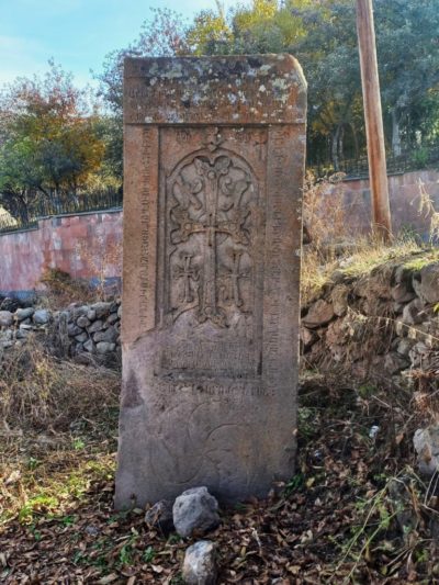 12 տողանոց արձանագրությունը փորագրված է խաչքարի չորս կողմում․ «Յանուն ամենակալին ԱՅ․ ես Մխիթար, որդի Դեղկա, հրամանավ իշխանաց իշխանին /մեծին Պռաւշո/ եւ որդո իւրո պարոն Հասանա, շինեցի զգեաղւս զՄարտիրոսս եւ կանկեց/ի զխաչս ի դուռն ՍԲ․ վկայարանիս ի բարեխաւսութի․ ինձ ե/ւ ամուսնո իմո Մամերին/, եւ որդո իմո Խարիփշահին, եւ դստեր իմո Ռզուքանին։ ՔՍ․ ՅՍ կազմեցաւ ձեռամբ Շնհ /աւորիս․ի թվ․։ ՉԼԲ։ /1283/ որք ընթեռնուք Յիշեցեք ի տր»։