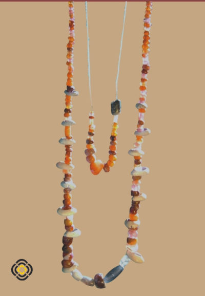 Յուրօրինակ գունային համադրություններով գտածոն կազմված է գնդաձև, գլանաձև, սկավառակաձև, տակառաձև ուլունքահատիկներից։ Շարի մեջ հավասար հեռավորությունների վրա հագցված են պարսիցծոցյան cyprea moneda (կաուրի) տեսակի ծովախեցիներ։Ուլունքահատիկներից մեկը, որ երկարավուն տեսք ունի պատրաստված է վանակատից (օբսիդիանից)։